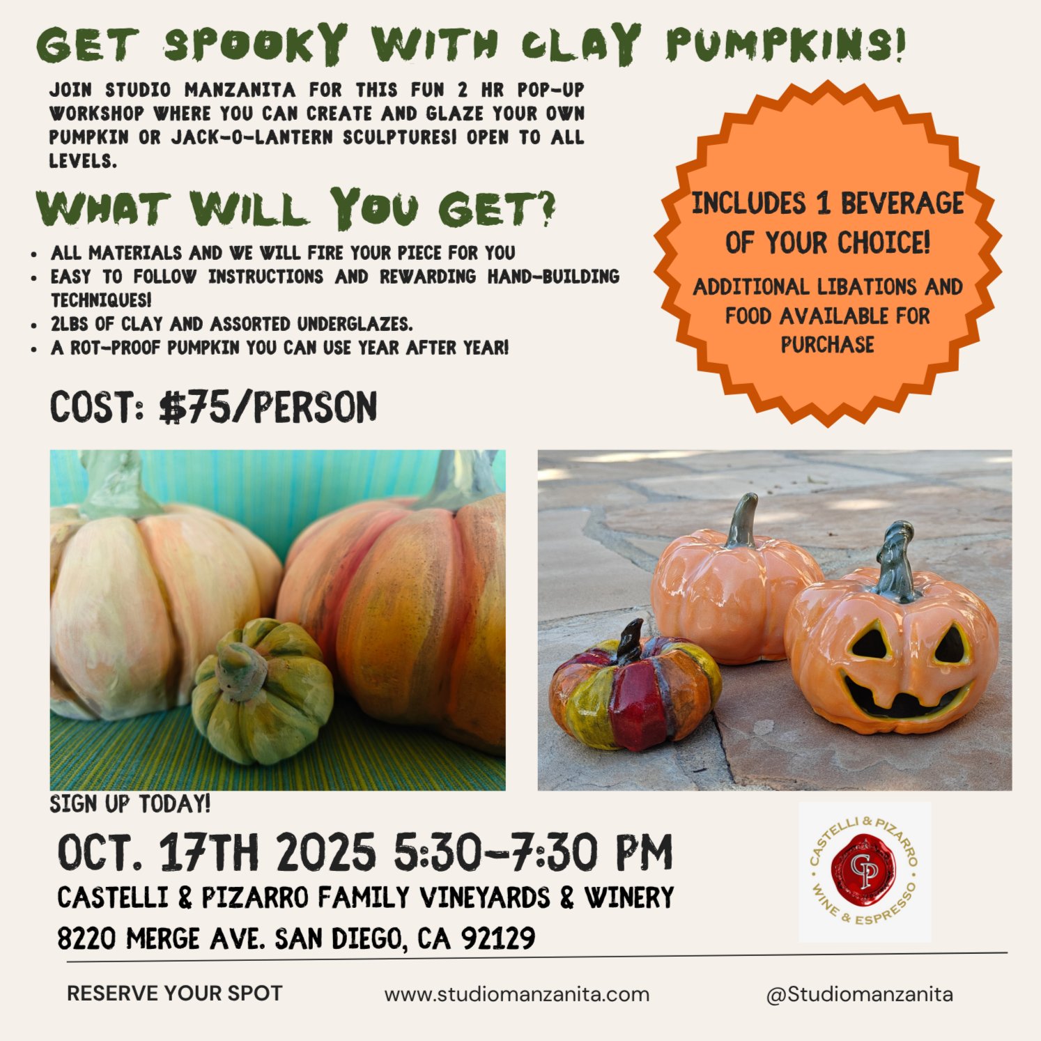 5:30- 7:30pm @ Castelli & Pizarro Family Vineyards & Winery 8220 Merge Ave. San Diego, CA 92129
